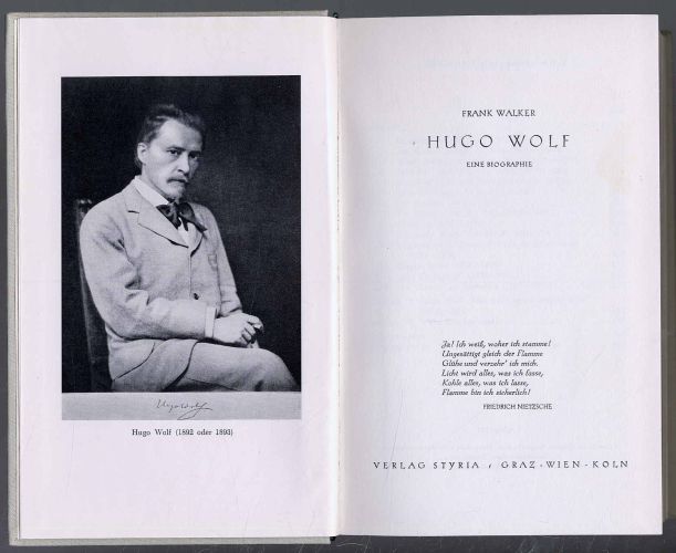 Wolf – Walker, Frank: Hugo Wolf. Eine Biographie. 1 1. Auflage. Graz u.a., Verlag Styria, 1953. Ca. 21 x 13 cm. 580 Seiten. Mit Abbildungen auf Tafeln. Orig.-Leinenband. Einband minimal angestaubt. Das unentbehrliche Standardwerk zum Leben und Schaffen Hugo Wolfs (österreichischer Komponist, 1860-1903), mit Werkverzeichnis. Gutes Exemplar.