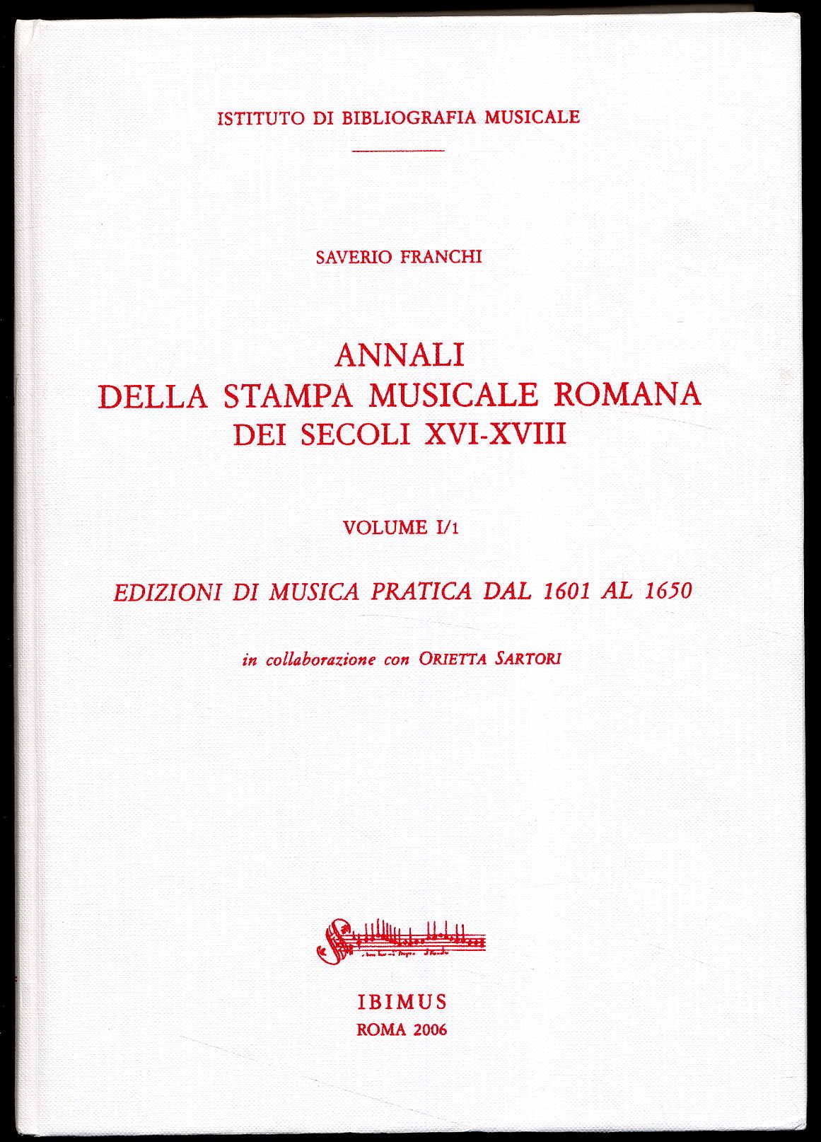 Franchi, Saverio: Annali della stampa musicale romana dei secoli XVI – XVIII. Vol. I/1: Edizioni di musica pratica dal 1601 al 1650. Ricerca storica, bibliografica e archivistica condotta in collaborazione con Orietto Sartori. Tomo 1. Roma, IBIMUS, 2006. Ca. 30 x 21 cm. LII S., 948 S., (4) Seiten. Mit zahlreichen Illustrationen. Weißer Orig.-Leinenband. In italienischer Sprache. Sehr gutes Exemplar.