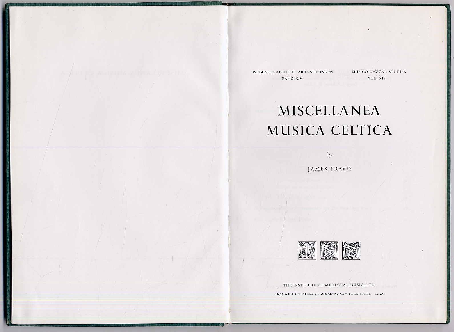Travis, James: Miscellanea musica Celtica. New York, The Institute of Mediaeval Music, 1968. Ca. 26 x 17,5 cm. (8) S., 78 S., (2) Seiten. Mit Abbildungen und Notenbeispielen. Grüner Orig.-Leinenband. Aus der Reihe: Wissenschaftliche Abhandlungen, Band XIV. Gutes Exemplar. Text in englisch.