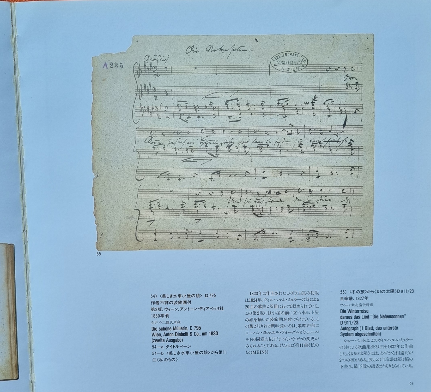 Schubert – ’84 Suntory’s Musikausstellung: Schubert. Tokyo, Okamura Printing, 1984. Querformat, ca. 24 x 25 cm. 168 Seiten. Mit zahlreichen, meist farbigen Abbildungen. Illustrierter orig.-kartonierter Einband. Kanten leicht berieben. Seltener Ausstellungskatalog der Suntory Ltd. in Tokyo. Text auf Japanisch, auch mit deutschem Grußwort und deutschen Bildlegenden.