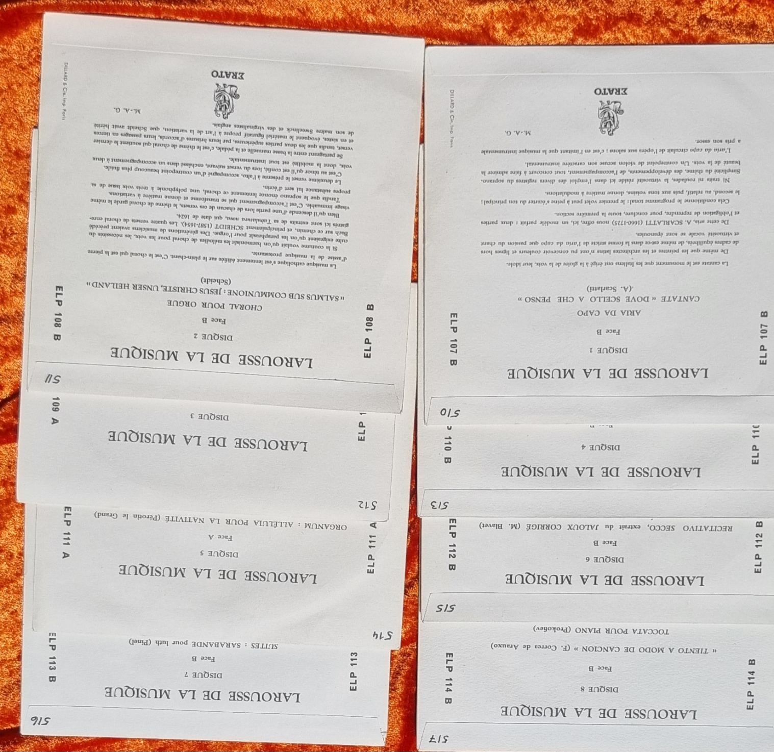 Larousse de la musique. Mappe mit 8 Schallplatten. 1957. Ca. 26,5 x 20,5 cm. 8 Singleschallplatten in bedruckter Hülle. Ohne die Textbände. Einbandrücken bestoßen. Die Schallplatten noch in der Schutzhülle und im bedruckten Umschlag.