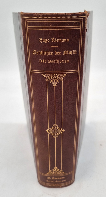 Riemann, Hugo: Geschichte der Musik seit Beethoven (1800-1900). Berlin und Stuttgart, W. Spemann, 1901. Ca. 23 x 15,5 cm. VII S., 816 Seiten. Orig.-Halblederband. Mit Exlibris. Schnitt stockfleckig, Unbeschnittenes, breitrandiges Exemplar. Aus dem Inhalt u.a.: Bis zum Tode Beethovens (Beethoven, Schubert, Weber); Epoche Schumann-Mendelssohn; Epoche Wagner-Liszt; Epigonen.
