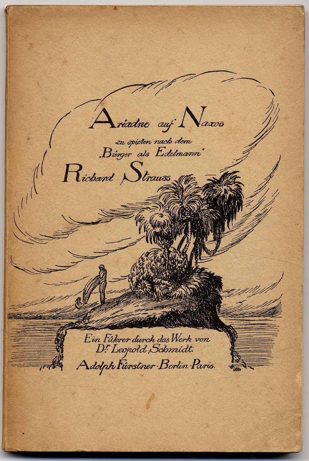 Strauss – Schmidt, Leopold: Richard Strauss. Ariadne auf Naxos. Zu spielen nach dem Bürger als Edelmann. Ein Führer durch das Werk. Berlin u. Paris, Adolph Fürstner, 1912. Ca. 18,5 x 12,5 cm. XII S., 111 S., (5) Seiten. Mit Notenbeispielen. Illustrierter orig.-kartonierter Einband. Einband etwas gebräunt, Stempel auf Titelblatt. Sonst gutes Exemplar.