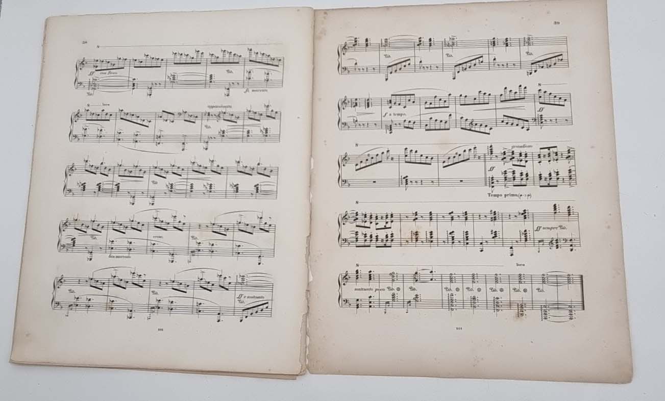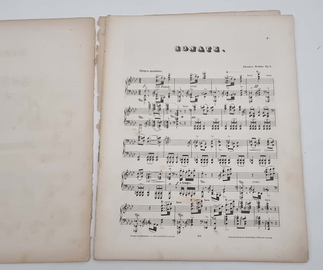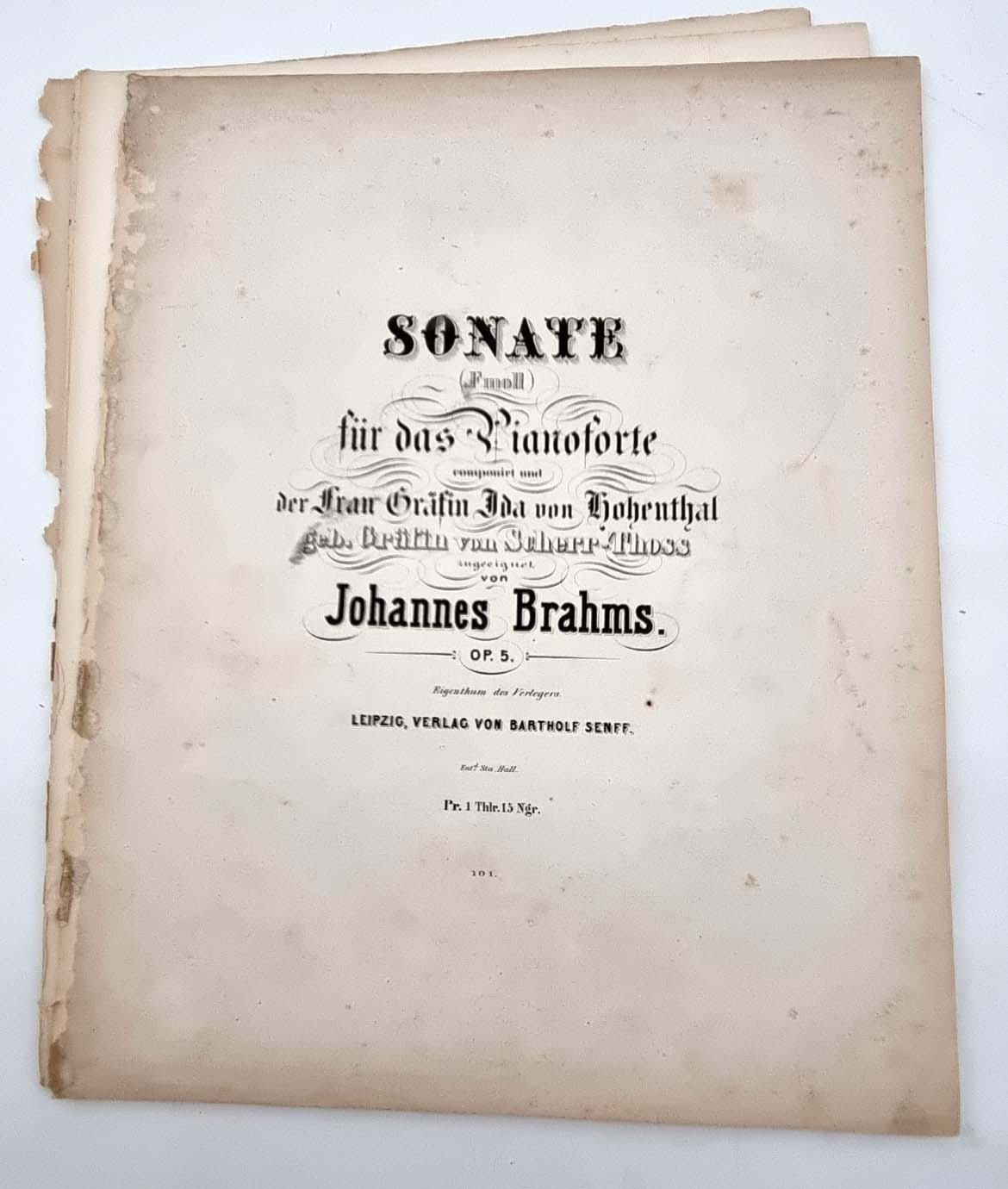 Brahms, Johannes: Sonate (F moll) für das Pianoforte componirt und der Frau Gräfin Ida von Hohenthal geb. Gräfin von Scherr-Thoss zugeeignet von Johannes Brahms. Op. 5. Leipzig, Verlag von Bartholf Senff, [1854] Ca. 31,5 x 25 cm. 39 Seiten, (1) w. Seite. Lithographierter Titel und gestochene Noten. Ohne Einband, ausgebundes Exemplar. Erste Ausgabe von Brahms gedruckten Opus 5. Plattennummer 101. Titelblatt mit eingedruckter Preisangabe: „Pr. 1 Thlr. 15 Ngr.“ Das erste und die beiden letzten Blätter lose und mit Einrissen am Rücken, Rücken bestoßen. Etwas stockfleckig.
